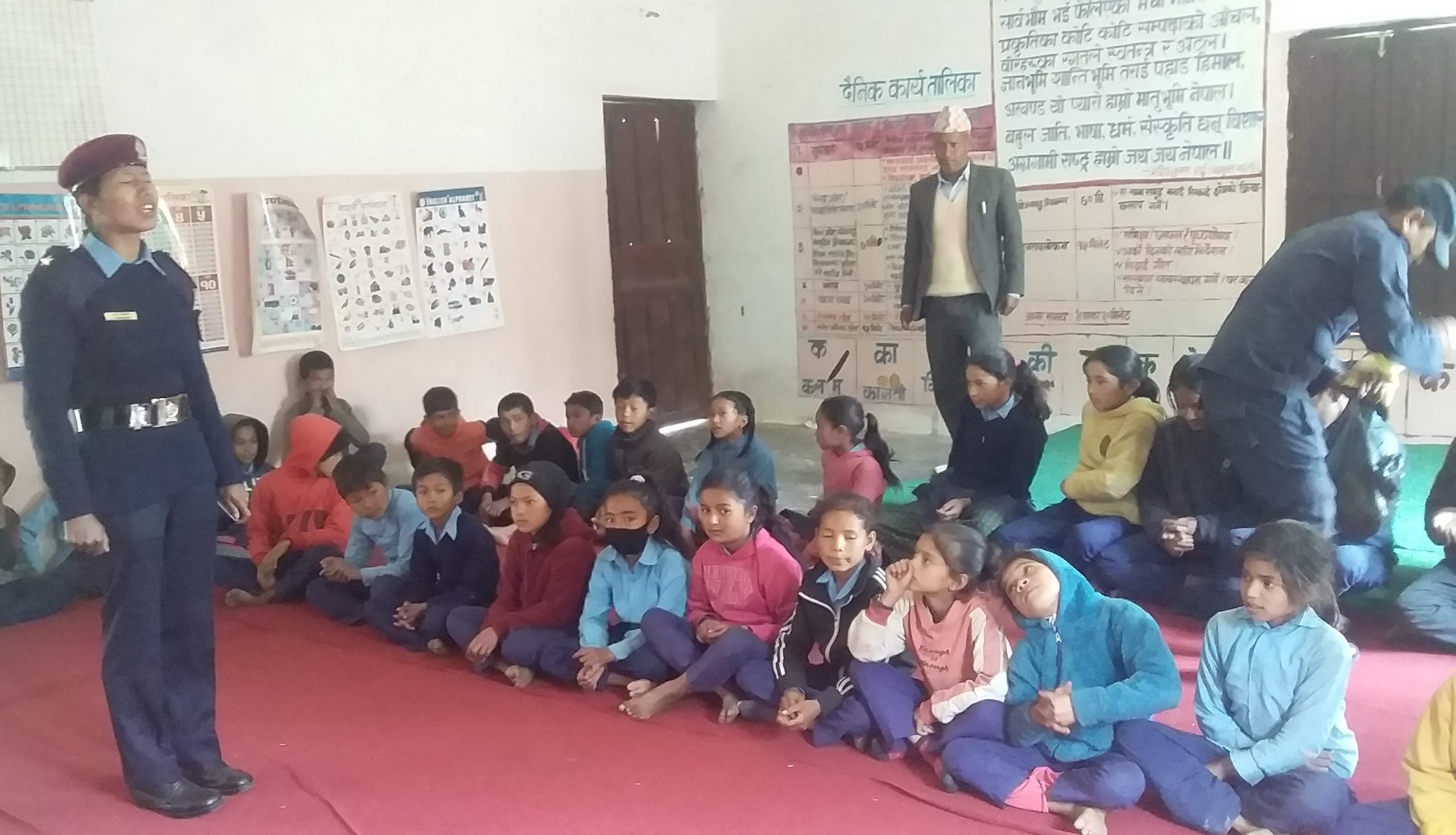 डोटी जिल्लामा पहिलोपटक चौकी इन्चार्ज भएर आएकी प्रहरी सहायक निरीक्षक दिपा चौधरी आधारभुत बिधालयका साना सान नानी बाबुहरु संग लागु औषध दुर्बेसनी सम्बन्धि छलफल र अन्तरत्रृmयामा बेस्त देखीन्छन ।