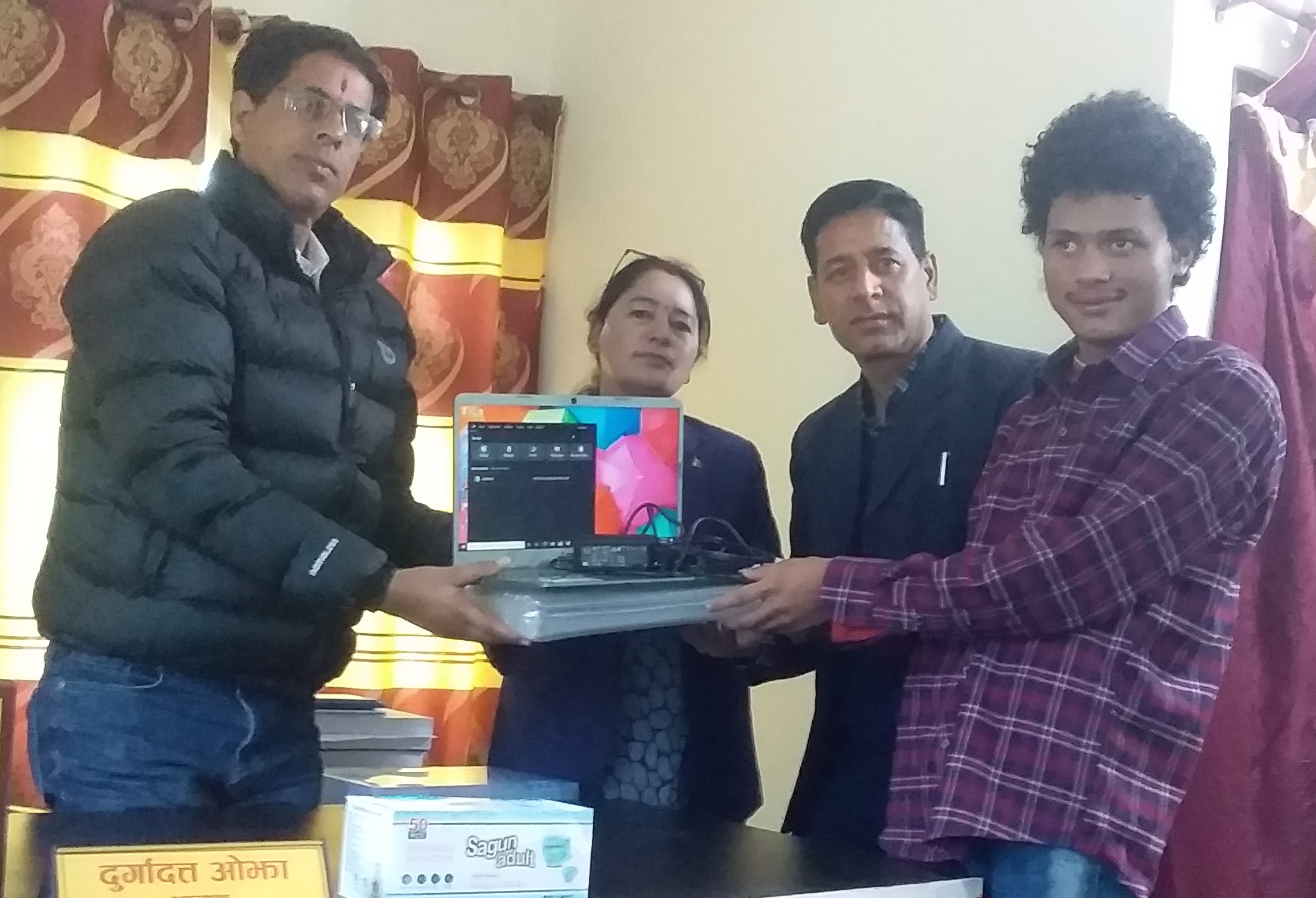 अध्यक्ष दुर्गा दत्त ओझा, उपाध्यक्ष जमुना कुमारी बोहरा र प्रमुख प्रसासकिय अधिकृत गणेस दत्त भट्टले बालकको सम्पुर्ण कागज पत्र हेर्दा १०० प्रतिसद दृष्टि बिहीन निलो कार्ड समेत भएकोले पढाई लाइ प्राथमिकता दिइ ७० हजार पर्ने आइ फाइभ एचपी ल्यप्टप उपलब्ध गराय ।